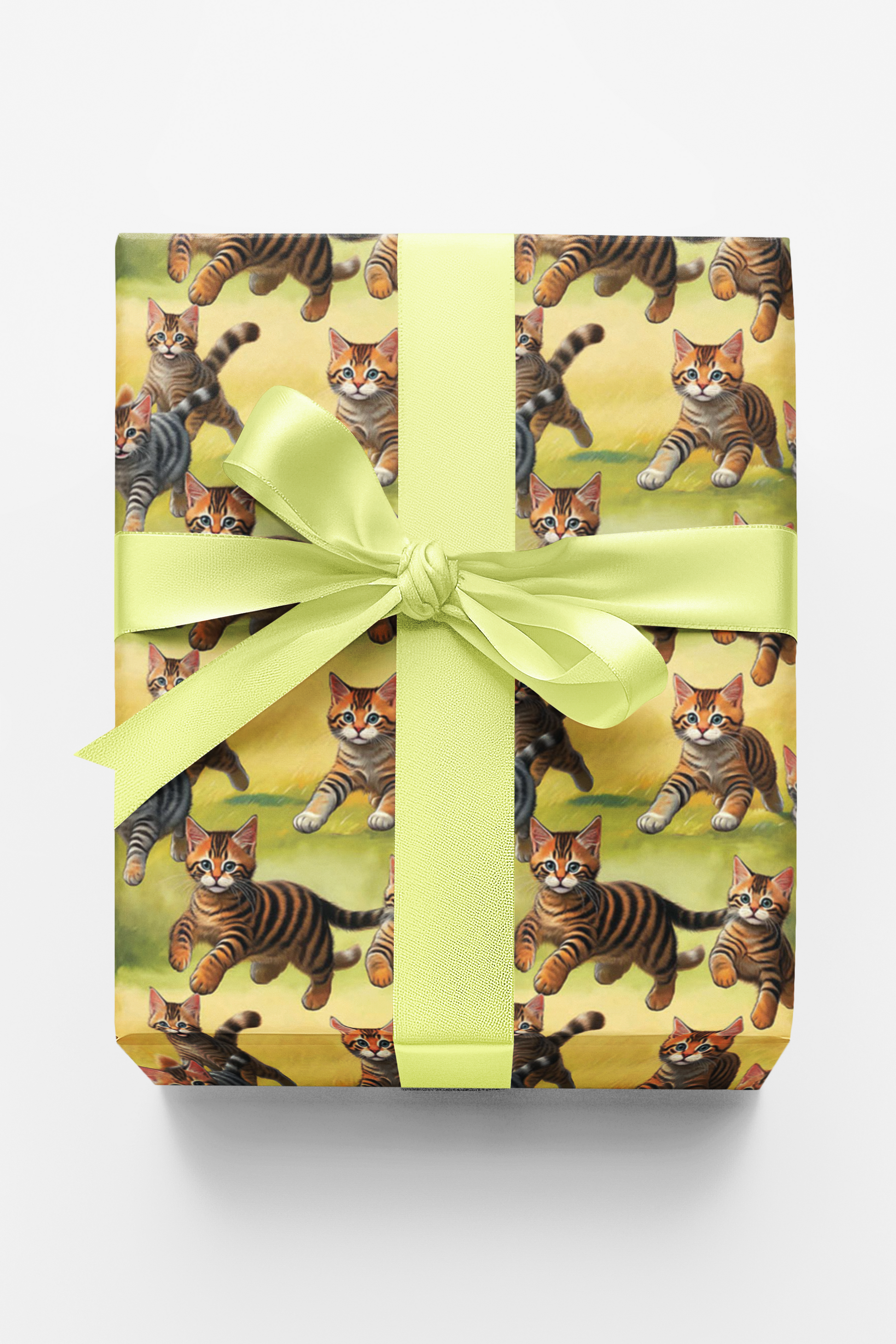 Unleash feline charm with Baby Cats at Play wrapping paper! Featuring lively tabby kittens in ginger and grey, pouncing and scampering against a soft green and yellow background. Perfect for cat lovers, birthdays, or any gift that needs extra purr-sonality. Pair with matching gift tags for a charming presentation!