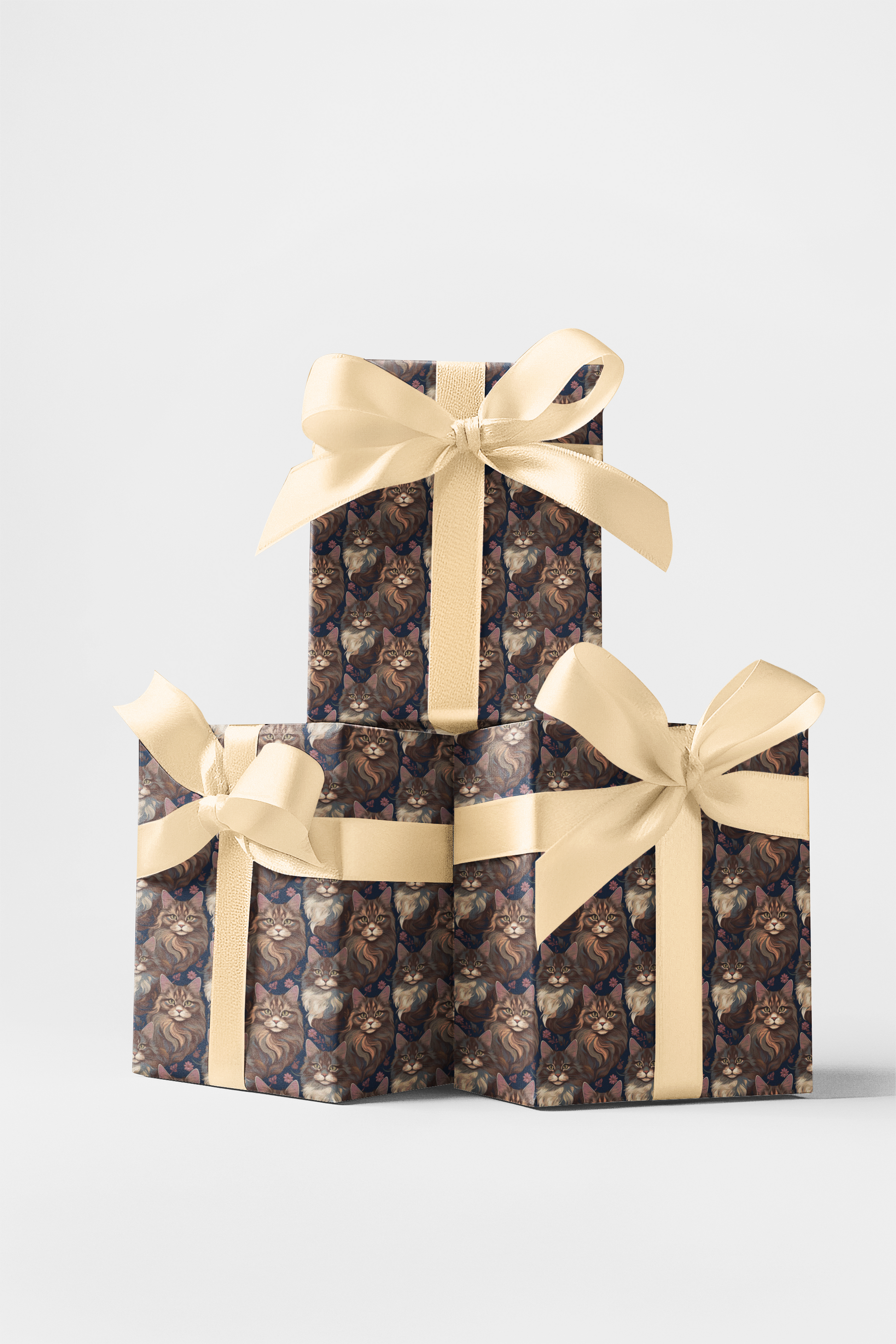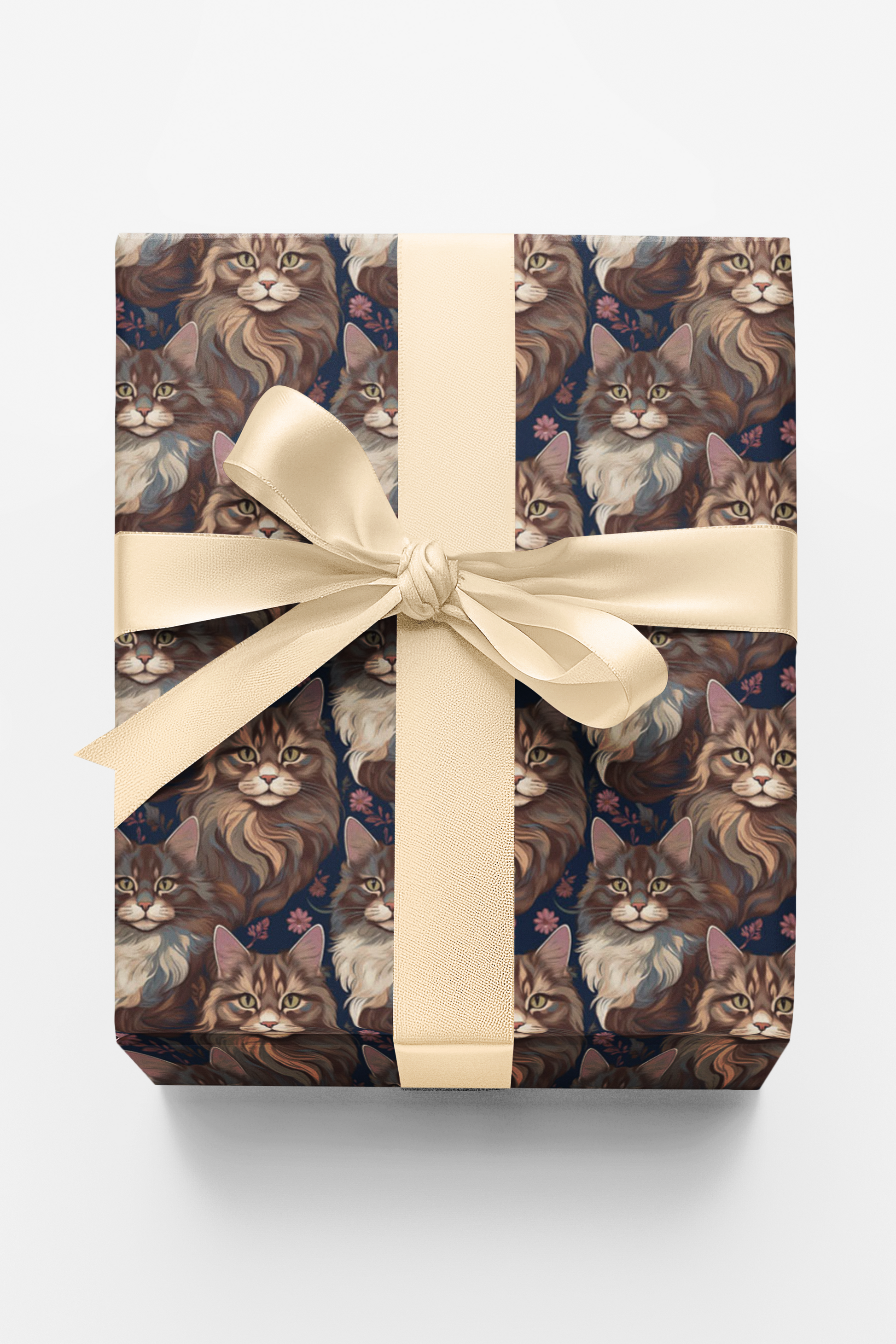Celebrate the majestic Maine Coon with our Purrfectly Maine Coon Cat wrapping paper! Featuring elegant portraits of this regal, long-haired breed on a dark background with subtle pink florals, it’s perfect for cat lovers, birthdays, adoption anniversaries, or any special occasion.